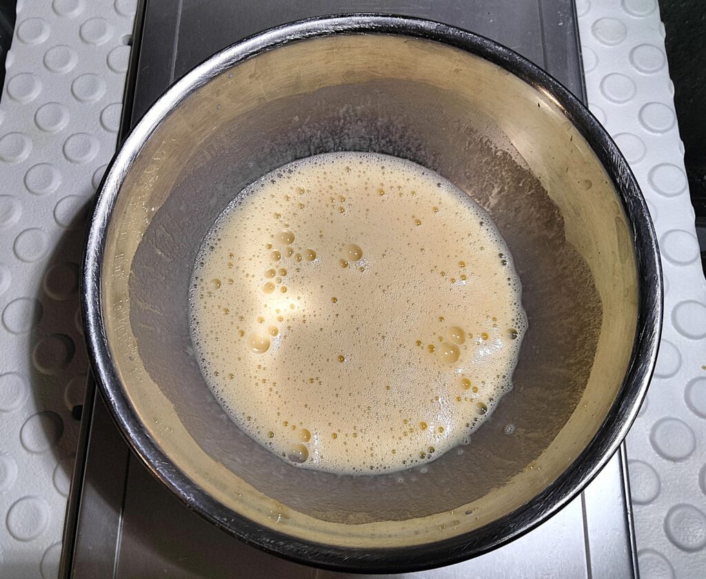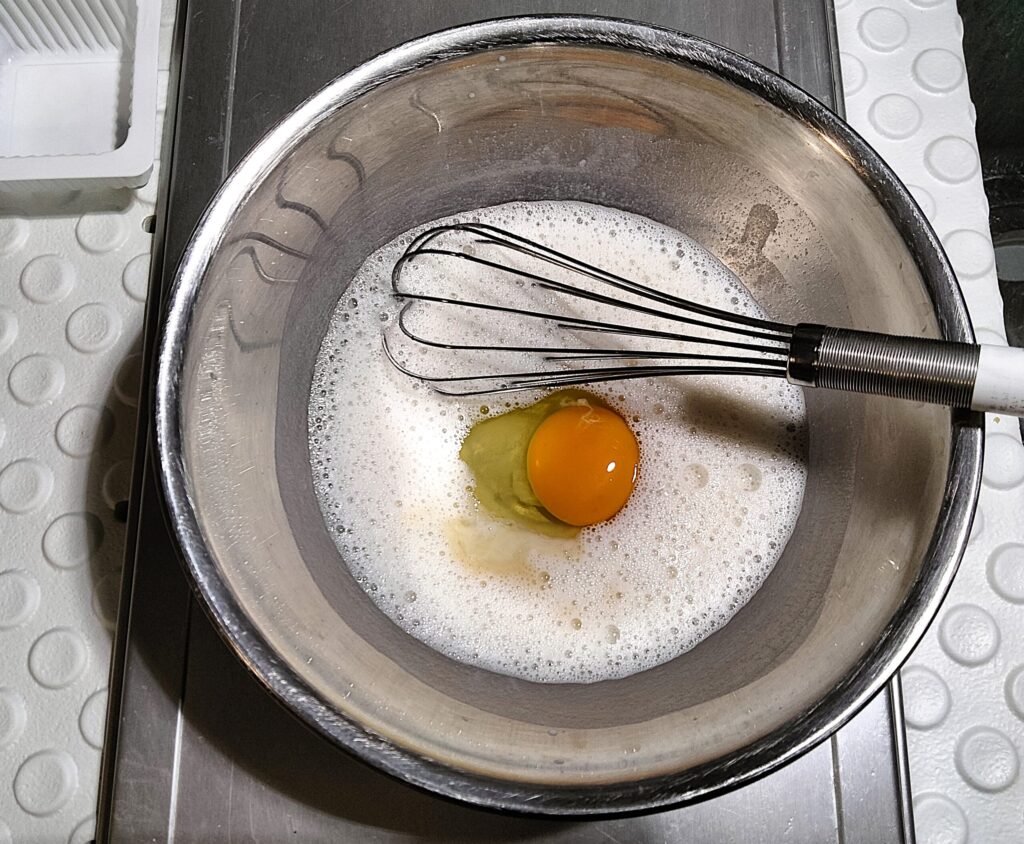 豆乳→砂糖→全卵→バニラエッセンスの順番に混ぜ合わせていきます。