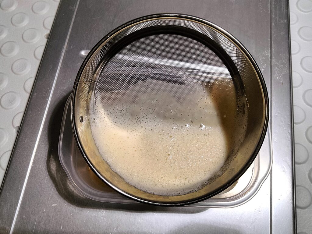 砂糖の溶け残りや卵白のカラザなどがあるかもしれないので、一度、シノワや、ざるを通して、濾しておきます。